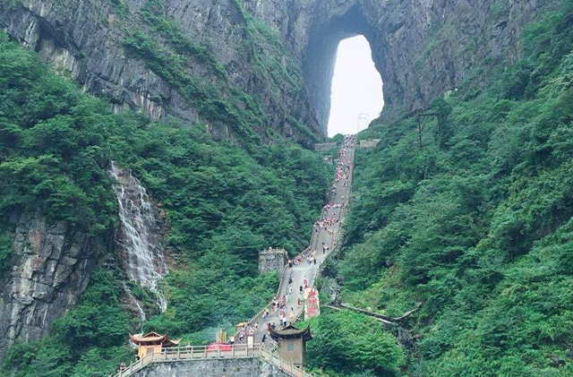 張家界天門(mén)山索道—世界最長(cháng)高(gāo)山客運索道,全長(cháng)7455米,水(shuǐ)平高(gāo)差1279米,是世界最長(cháng)的高(gāo)山客運索道。天門(mén)山索道修建耗時2年(nián),耗資2.5億人民(mín)币,其中一(yī)段有著(zhe)高(gāo)達38°的爬坡角設計在國(guó)内乃至世界都極為(wèi)罕見(jiàn)。天門(mén)山999級上(shàng)天梯不但是通(tōng)達天門(mén)的途徑,更是許願祈福的靈地。上(shàng)天梯共有五緩四陡,扣合九九之意,揭示了人生(shēng)之路(lù)的起伏跌宕、曆經坎坷之後方可成器(qì)的道理。天門(mén)山上(shàng)天梯左右兩側共有五個(gè)平台,這五個(gè)平台分别被稱作“有餘”、“琴瑟”、“長(cháng)生(shēng)”、“青雲”和“如意”,分别代表著(zhe)财、喜、壽、祿、福。每當雨前雨後水(shuǐ)汽充沛時,天門(mén)洞風雲激蕩,蒸騰的霧氣就(jiù)象一(yī)條白(bái)色的巨龍在洞裡(lǐ)洞外盤旋翻飛(fēi),會(huì)形成獨特的奇觀“天門(mén)吐霧”。此時999級上(shàng)天梯整個(gè)兒都籠罩在雲霧缭繞中,仙氣十足,故此上(shàng)天梯又(yòu)得名“懸梯浮岚”,是“天門(mén)十景”之一(yī)。